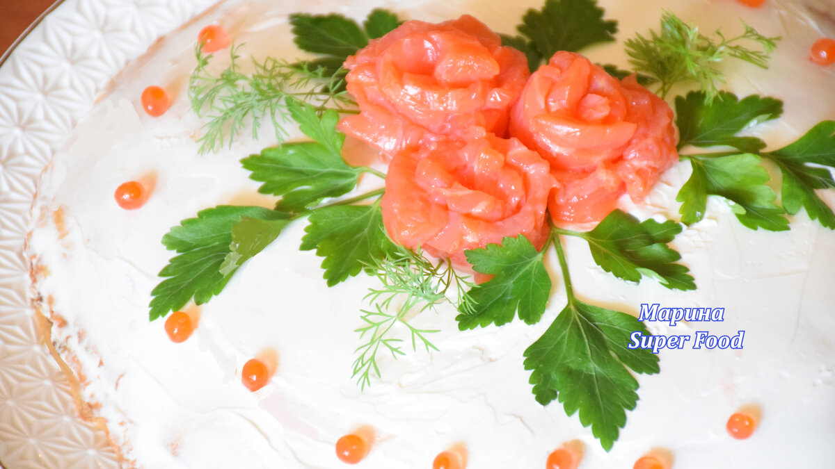 Теперь начинается этап сборки торта: на каждый блин наносят слой сливочного творожного сыра и немного красной икры. Далее накрывают следующим блином, который смажется рыбой и зеленью. Процесс продолжается до завершения всех блинов, чередуя слои начинки.