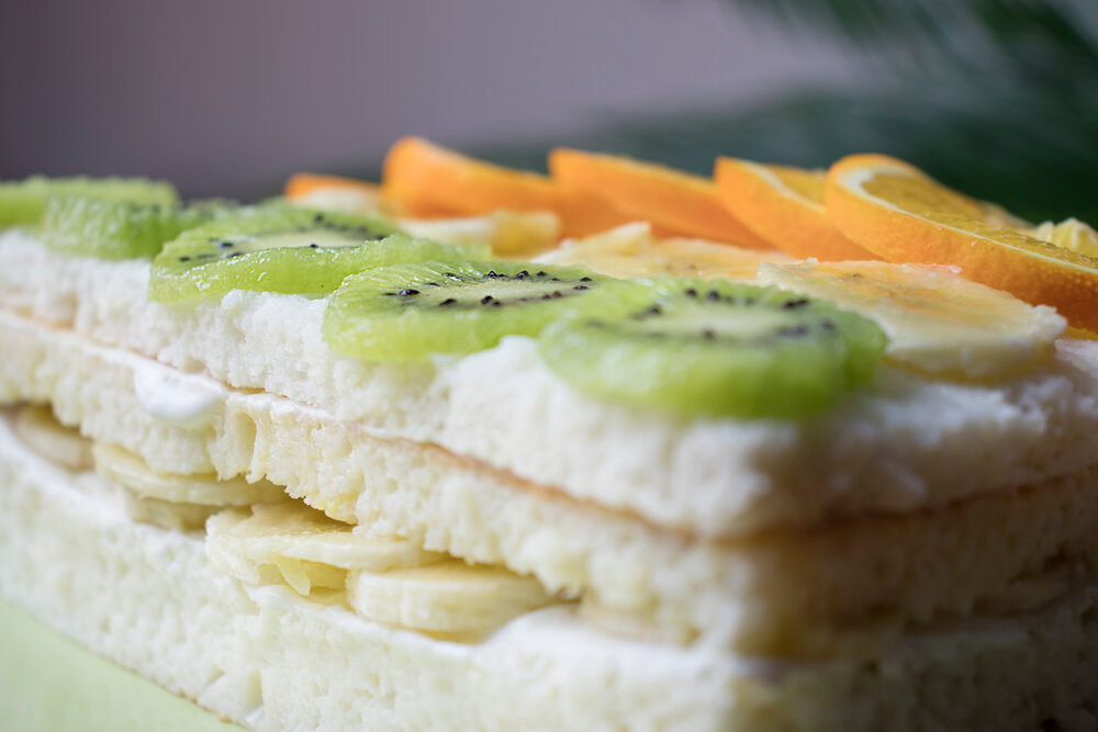 - Собираем торт: на нижний корж кладем слой киви и бананов, накрываем другим коржом и поверх вновь выкладываем фрукты.
