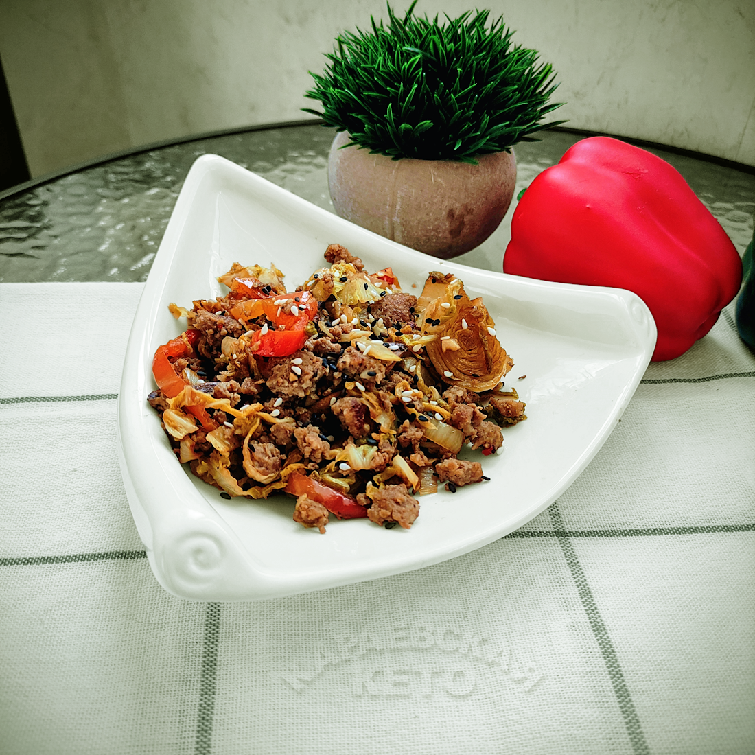 Финальная стадия: Вернуть фарш в сковороду, перемешать все ингредиенты. Готовое блюдо посыпать кунжутом.